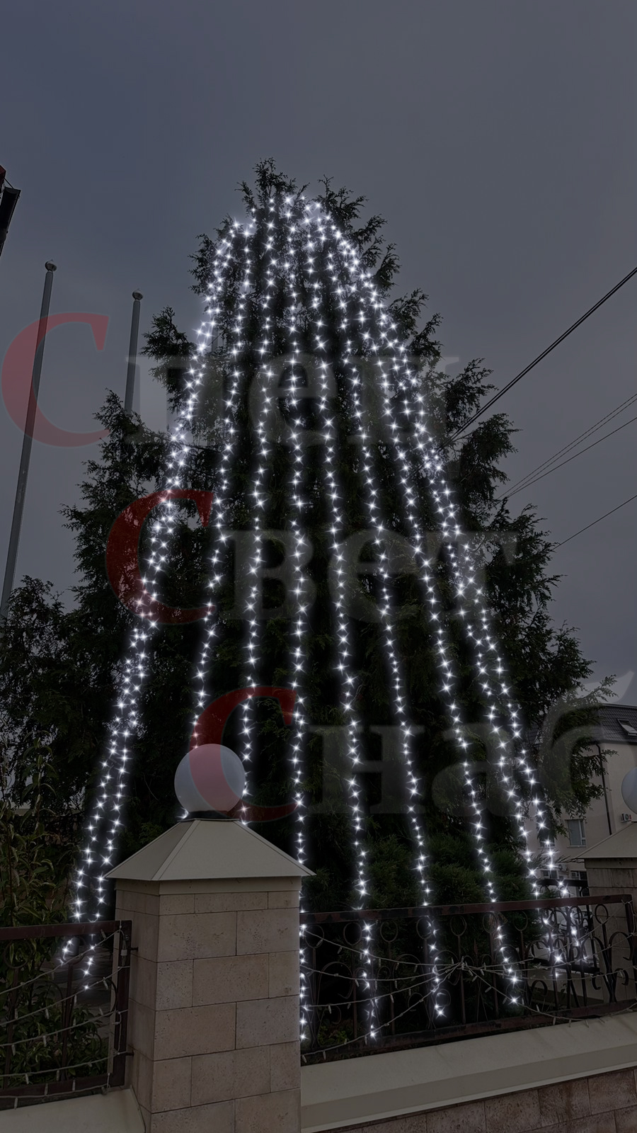 Гирлянда Спайдер имеет белое цветовое исполнение, без мерцания, т.е. обеспечивает статическое свечение. Количество нитей – 3, длина – 20 метров, что позволит празднично обустроить любое дерево или конструкцию. Особенно эффектно оно смотрится на еловых породах деревьев – оптимальный вариант украшения. Кроме этого, данное светодиодное изделие можно дополнить другими дополнительными светящимися элементами.